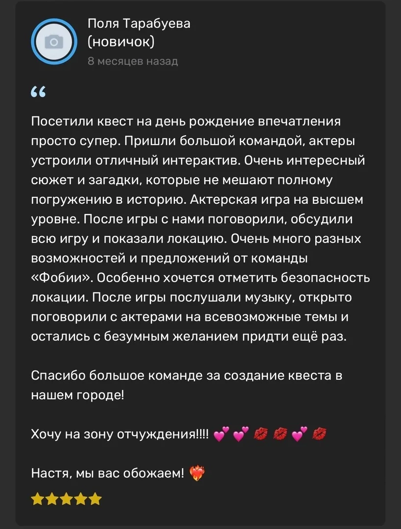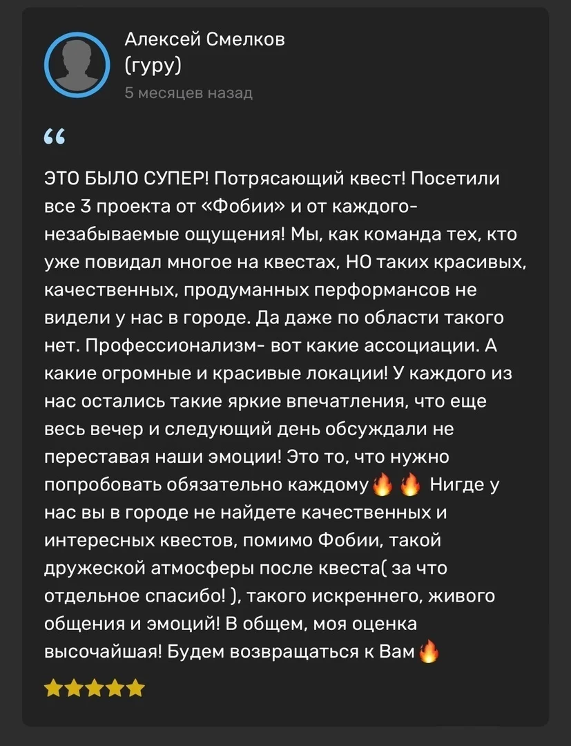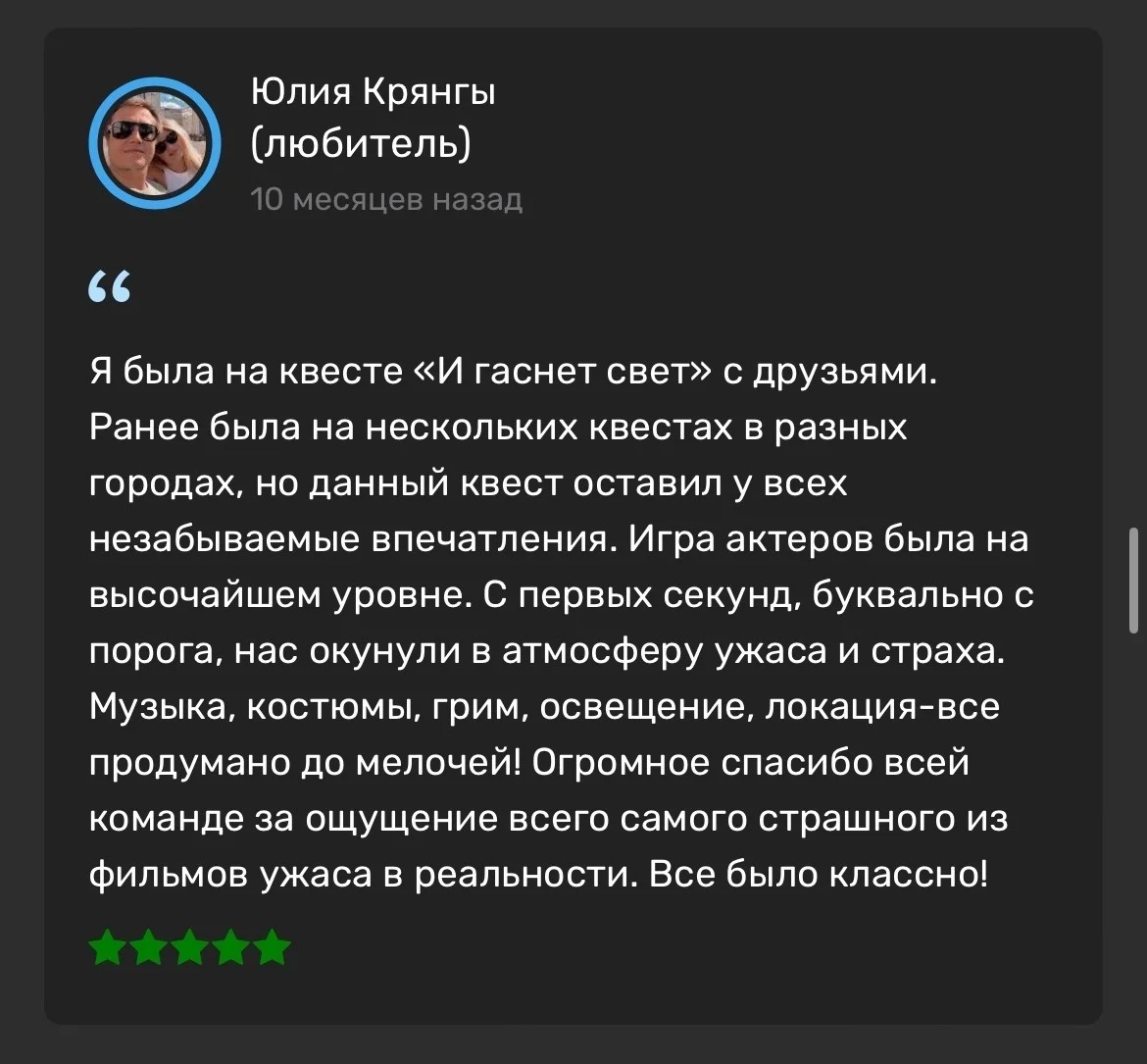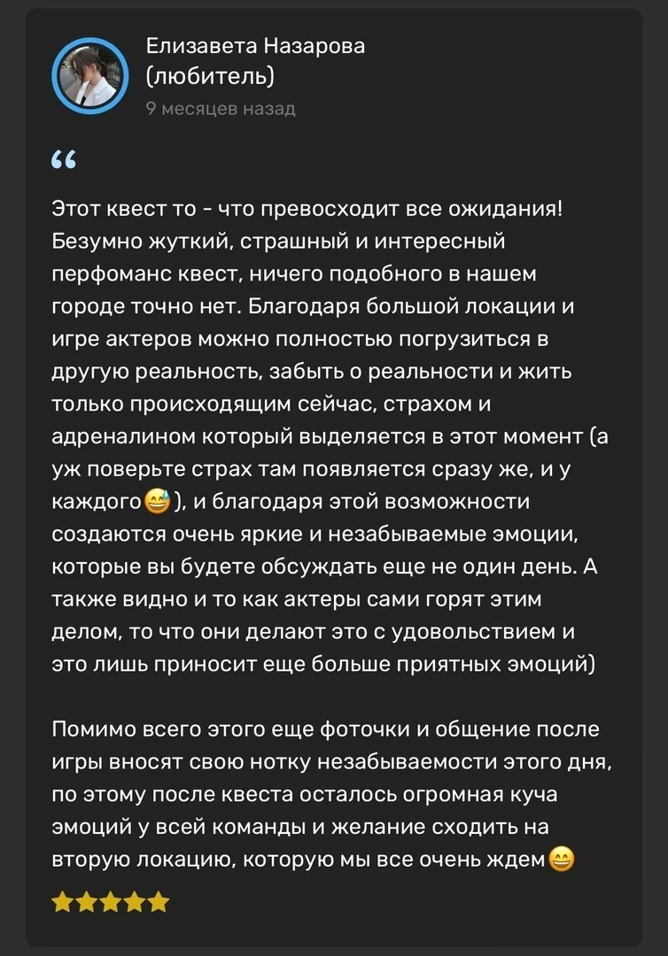 «Астрал» — это иммерсивное приключение, созданное для детей от 8 лет и взрослых. Один универсальный формат прохождения позволяет полностью погрузиться в мистическую атмосферу, где реальность переплетается с потусторонним. Детализированные локации, актёрская игра и напряжённый сюжет создают эффект присутствия и яркие эмоции для любой компании.